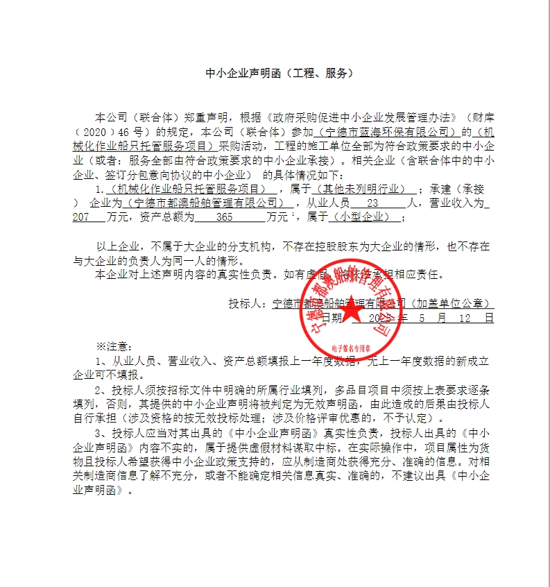 本項目為機械化作業(yè)船只托管服務項目,地址為寧德市全海域,委托代管采購人自有四艘機械化作業(yè)船只,根據(jù)采購人作業(yè)安排在寧德市三都澳內(nèi)、福鼎市指定海域開展巡航海漂垃圾打撈工作等,具體詳見中標人投標文件 |
